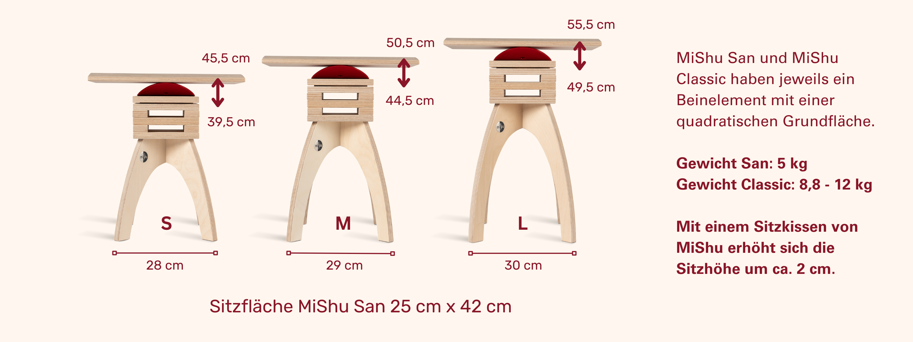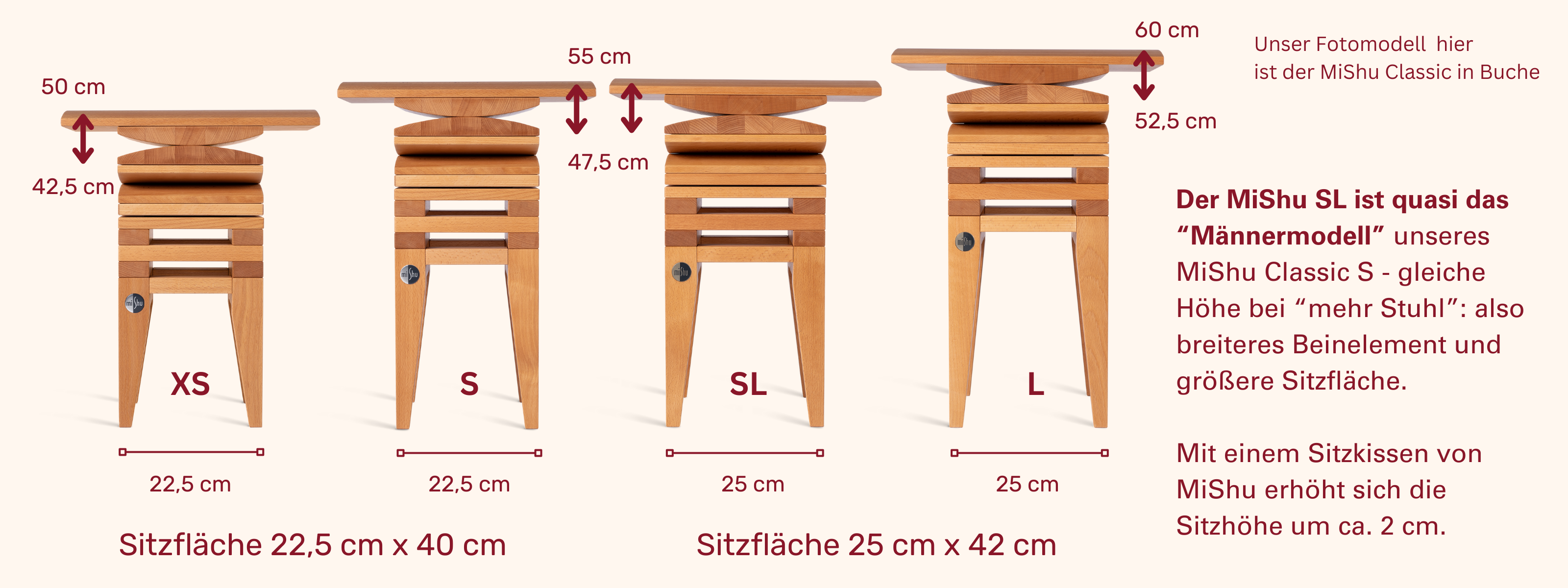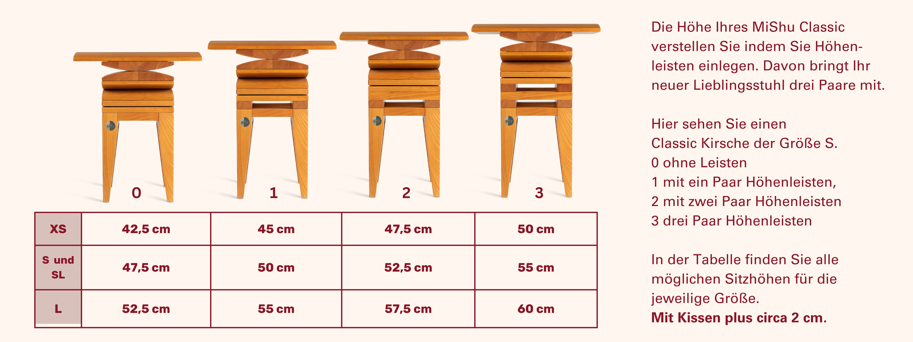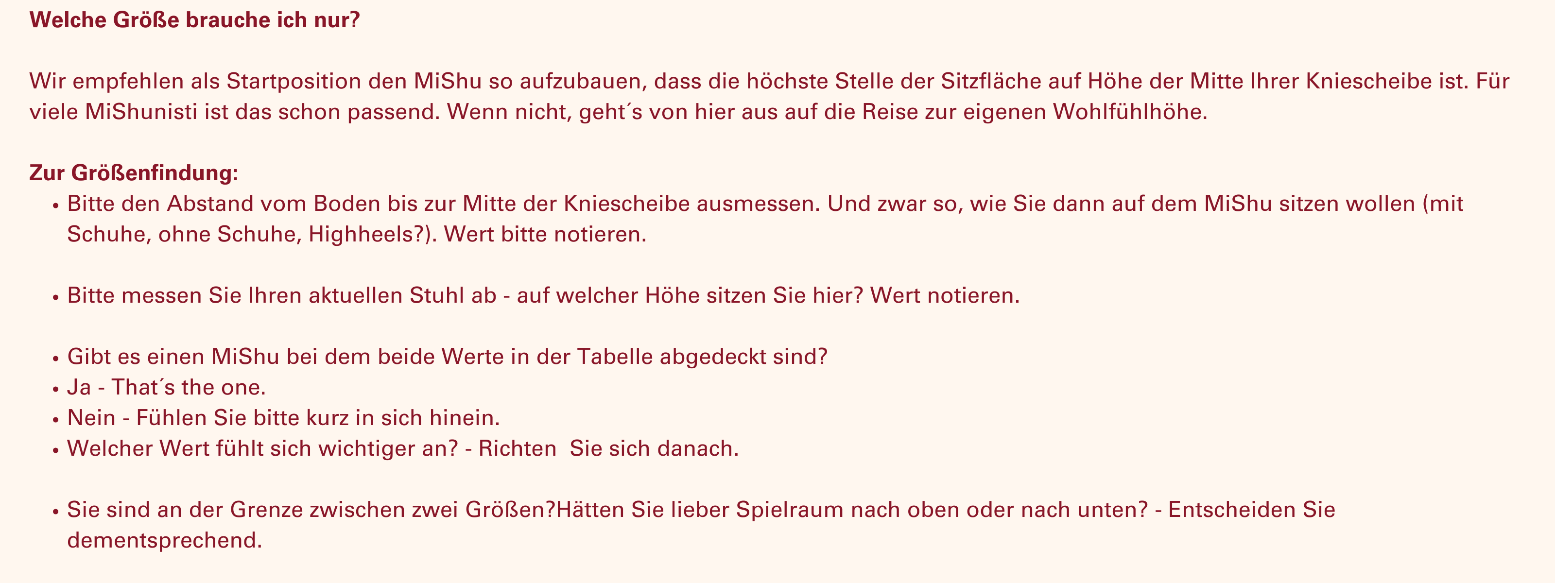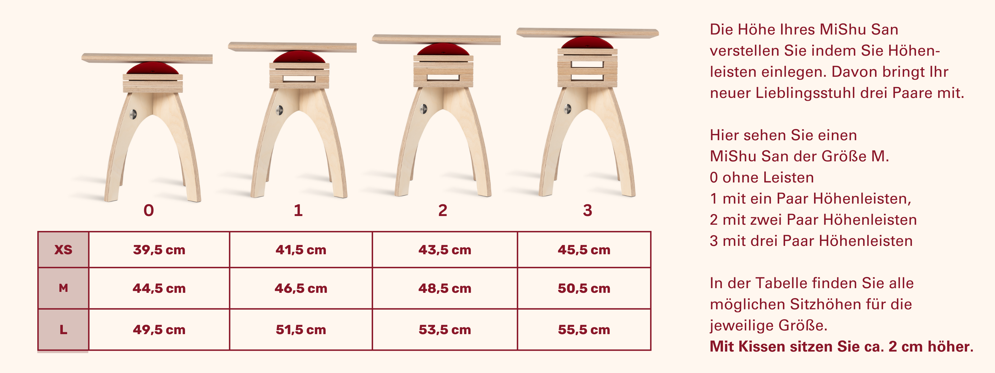 Bei den Produkten finden Sie eine Größentabelle. Jeder MiShu hat 3 Paar Höhenleisten im Köfferchen, wenn er uns verlässt- damit erreichen Sie 4 verschiedene Sitzhöhen. Bei Bedarf können noch zusätzliche Paare bei uns erworben werden. Messen Sie Ihre aktuelle Sitzhöhe aus und vergleichen Sie diese mit der Tabelle. Sie sind unsicher? Kein Problem - wir sind für Sie da. Kontaktieren Sie uns oder rufen Sie einfach an. 08092-85 266 58